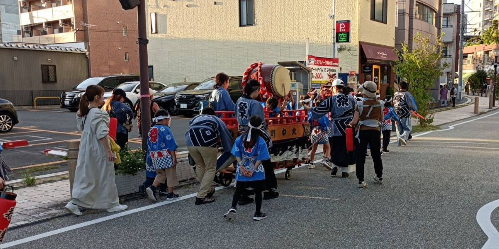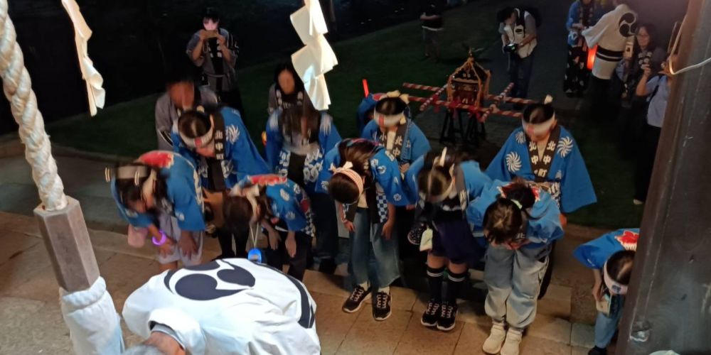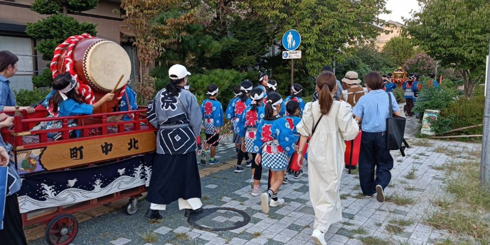 子ども神輿の奉納25 水内総社日吉大神社の秋季例祭に奉納する「子ども神輿」とお祀りを告げる「曳太鼓」の練り歩きが催されました。 夕方5時に出発した神輿が町内に「わっしょい」「わっしょい」と元気を届けます。 子ども神輿は、無事に日吉大神社に奉納され、氏子の子どもたちも氏神様にお礼の挨拶を申し上げました。